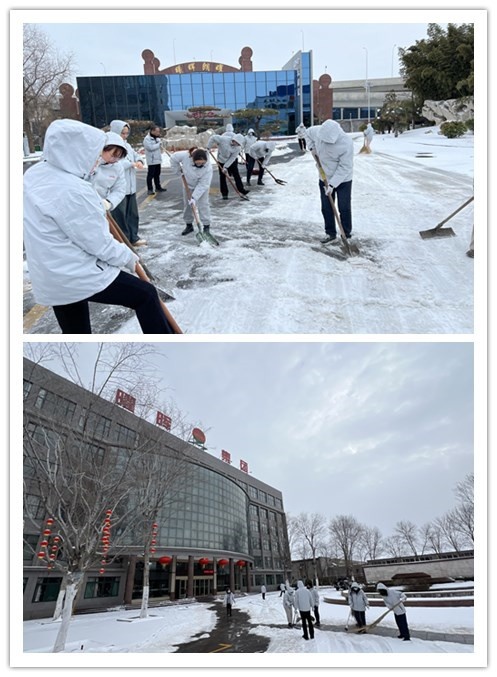 經(jīng)過一個多小時的努力奮戰(zhàn),集團(tuán)院內(nèi)積雪清掃干凈,開辟出一條條洋溢著暖暖溫情的安全之路。